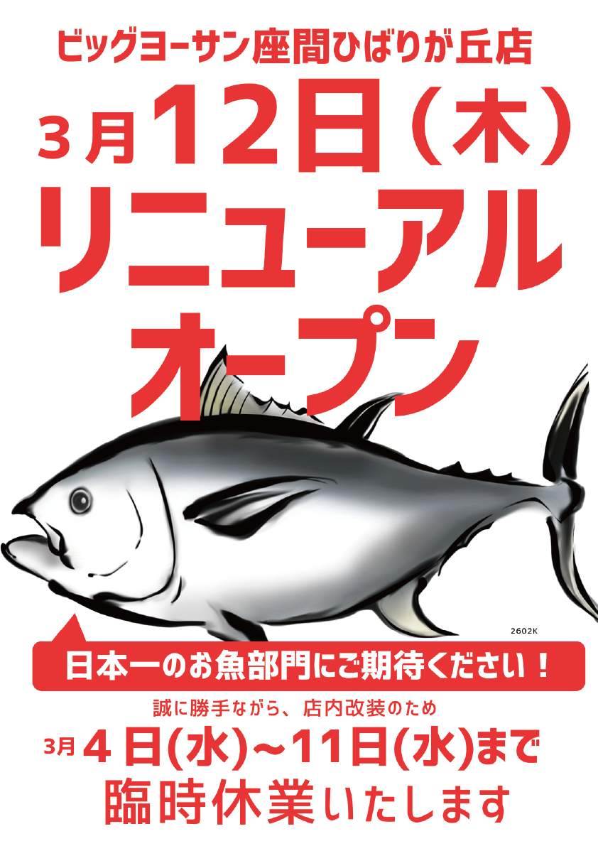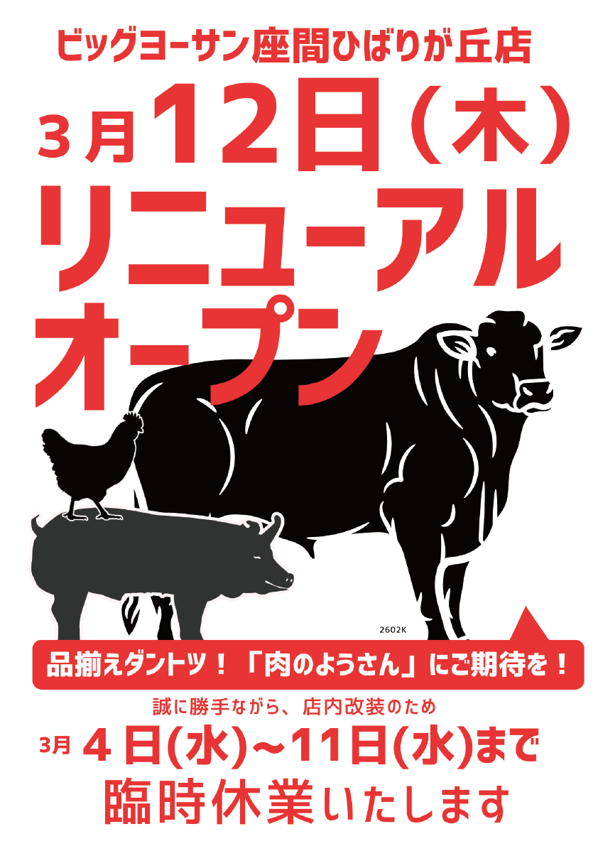 ビッグヨーサン座間ひばりが丘店は、2026年3月12日(木)リニューアルオープン致します。