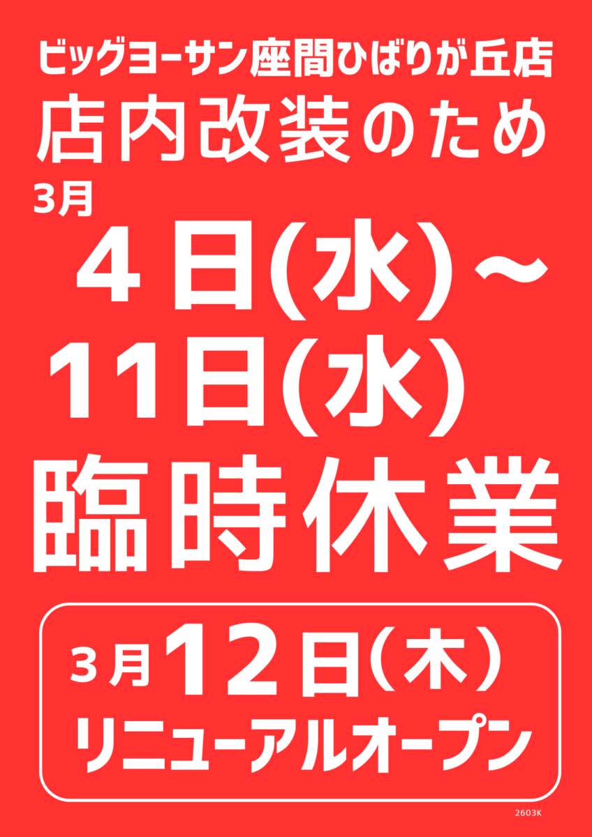 ビッグヨーサン座間ひばりが丘店は、誠に勝手ながら店内改装のため、3月4日(水)〜11日(水)まで、臨時休業いたします。